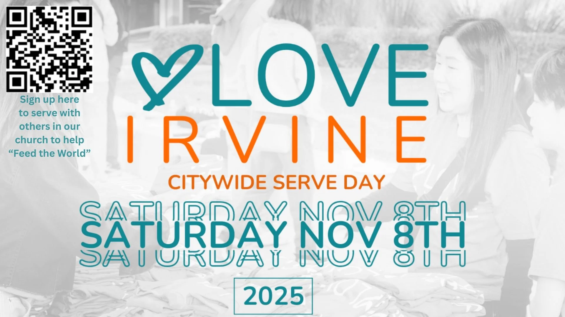 Get your "serve" on! Spectrum Church will be participating with the Love Irvine organization and other Irvine churches to pack bags for Feed the World on November 8. We have 15 slots to fill for a 2-hour shift, from 9-11am. If you would like to join the assembly line and bless those in need, contact info@spectrumchurchirvine.org or use the QR code above.